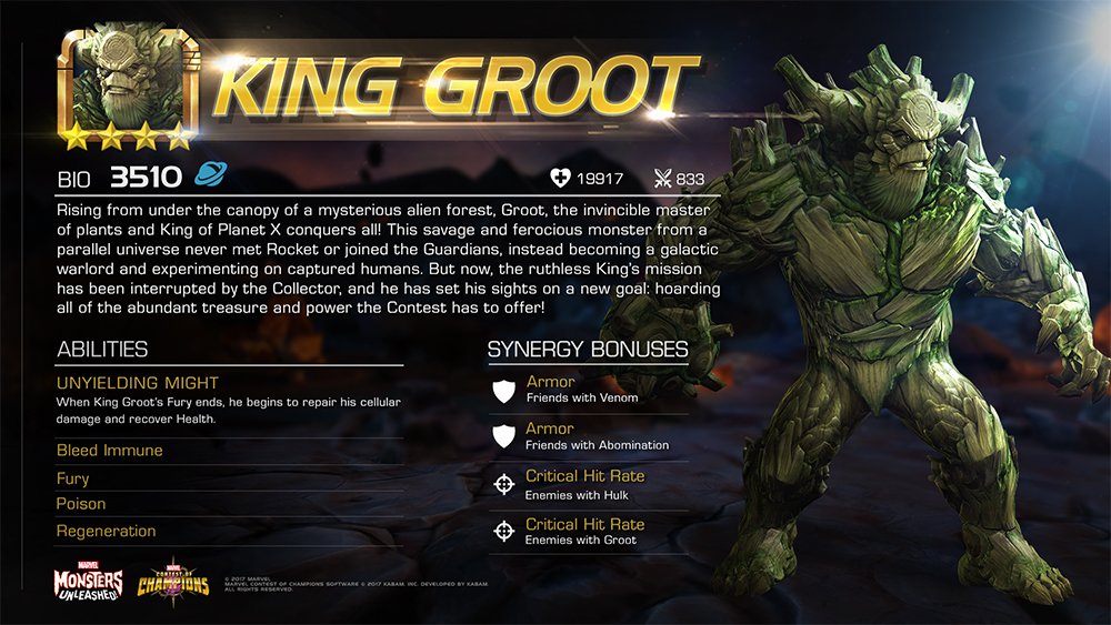 El rey Groot o King Groot es un personaje de tipo cósmico que se caracteriza por su aguante en las peleas. Gracias a su habilidad de regeneración consigue recuperar muchos puntos de vida durante el transcurso de la pelea. También cómo característica tiene un envenenamiento bastante poderoso con uno de sus super ataques. A pesar de no ser de los mejores luchadores, se defiende lo suficiente contra cualquier enemigo, por su inmunidad a la hemorragia.