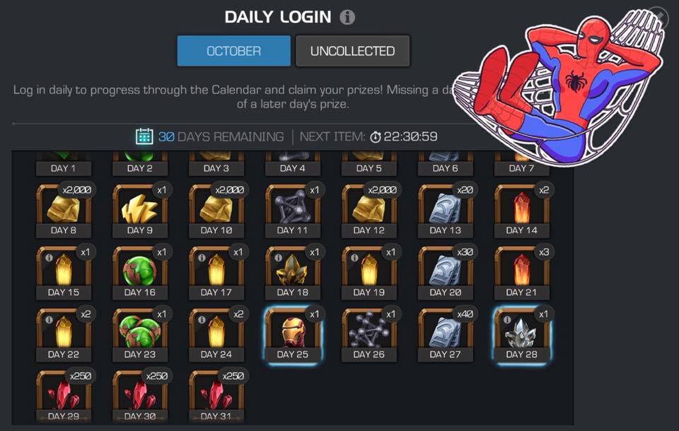 Este mes podremos obtener un Iron-Man(Infinity War) de 3 o 4 estrellas en el día 25, así que no olvides conectarte cada día para recibir todos los premios.